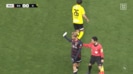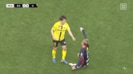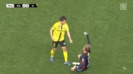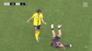 すると、後ろからやってきた柏のDF杉岡大暉が、「早く出ろ」とばかりに荒木の背中を押して急かす。対して荒木も何やら反論して歩みを止めると、再び杉岡に二度三度と小突かれた瞬間、オーバーリアクションで後ろに倒れ込み、ピッチにストンと転がってみせたのだ。