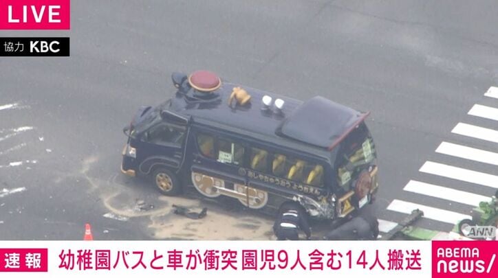 幼稚園バスと車が衝突 園児9人含む14人搬送 速報 2026/02/24 11:36 拡大する 福岡県遠賀町の交差点で幼稚園バスと普通乗用車が出合い頭に衝突する事故があり、園児9人を含む14人が搬送されました。 警察などによりますと午前9時過ぎ、遠賀町の交差点で幼稚園バスと普通乗用車が衝突しました。幼稚園バスに乗っていた職員4人と園児9人、普通乗用車に乗っていた高齢とみられる男性1人が病院に搬送されています。詳しいけがの程度は分かっていません。 事故は出合い頭に発生したとみられていて、バスの後部と普通乗用車の前方が衝突したということです。現場は見通しの良い交差点で警察は事故の経緯を調べています。(ANNニュース) 続きを読む
