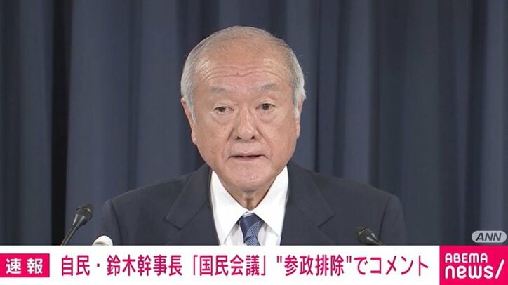 国民会議の参政党“排除”について 自民・鈴木幹事長「消費税廃止主張なので議論がなじまない」 速報,会見 2026/02/24 13:50 拡大する 自民党の鈴木俊一幹事長の24日の記者会見で、消費税減税や給付付き税額控除について議論する超党派の“国民会議”に、参政党が「参加を断られた」と不満を述べている問題について、質問が出た。 記者が「幹事長は以前『野党が広く参加することが望ましい』との考えを示されていましたが、参政党の幹部は自民党から参加を断られたと明らかにしています。参加に意欲のある野党が国民会議に入らないことは、幅広い国民の意識を反映した活発な議論を目指す上で、マイナスにはならないでしょうか」と質問。 続きを読む