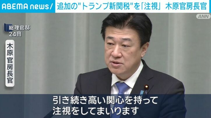 追加の“トランプ新関税”を「注視」 木原官房長官 速報 2026/02/24 19:17 拡大する アメリカのトランプ政権が日本時間の24日午後2時すぎから各国に対し一律10%の新たな追加関税を発動することを受け木原官房長官は、引き続き関税をめぐる動向を注視すると強調しました。木原官房長官「我が国としては判決の内容および(関税)措置の影響等を十分に精査しつつ、引き続き米国政府の対応を含む関連の動向や、昨年の日米間の合意に与えうる影響について引き続き高い関心を持って注視をしてまいります」 日米関税合意に基づく対米投資について、日本政府は18日、第一陣として日本円で総額およそ5兆5000億円の投資案件で合意したと発表しました。 続きを読む