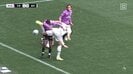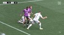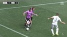 すると京都が1点リードで迎えた35分、敵陣左サイドでスローインを獲得した福岡は、MF藤本一輝がジョアン・ペドロにボールを奪われたところに、ザヘディが素早くプレスをかける。空中に浮き上がったボールに対して、ジョアン・ペドロが頭でコントロールしようしたところへザヘディの左足が伸び上がってきたため、危うく顔面を蹴り上げそうになった。