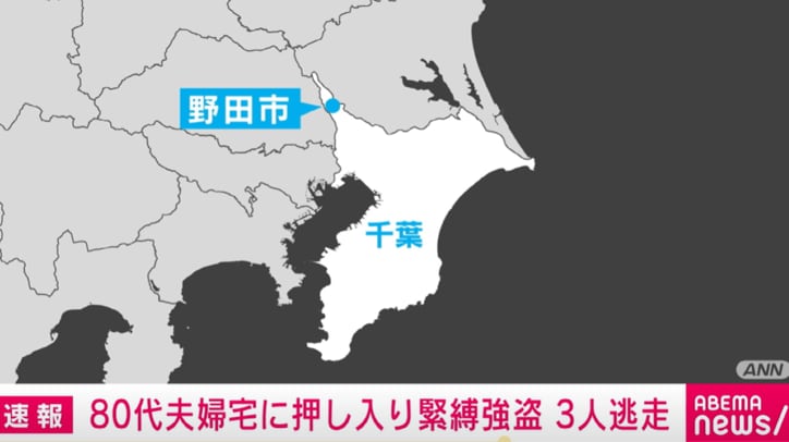 80代夫婦宅に押し入り緊縛強盗 3人逃走 速報 2026/02/25 08:24 拡大する きょう未明、千葉県野田市の高齢夫婦の住宅に男ら3人が押し入り、男性に暴行を加えたうえ、金庫を奪って逃走しました。 午前2時すぎ、野田市大殿井の住宅で「ハンマーで殴られて、金庫を取られた」と住人の男性から110番通報がありました。 警察によりますと、80代の夫婦が寝ていたところ、突然男ら3人が押し入り、男性の両腕両足を縛り、頭をバールのようなもので殴ったうえ、金庫を奪って逃走したということです。 男性は病院に搬送されましたが、命に別状はありません。妻も顔を布のようなもので巻かれたとのことですが、けがはありませんでした。 続きを読む