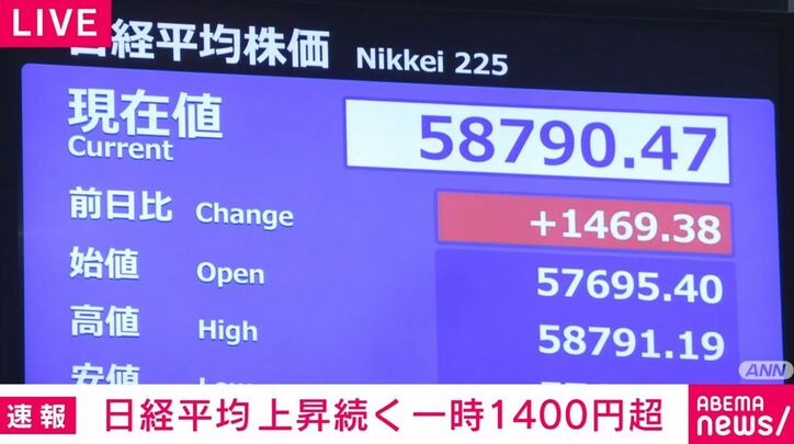 日経平均 上昇続く 上げ幅は一時1400円超 速報 2026/02/25 15:02 拡大する 午前中に取引時間中の最高値をおよそ2週間ぶりに更新した日経平均株価は、午後も値上がりしています。上げ幅は一時1400円を超えました。 きょうの日経平均は取引開始とともに値上がりしました。2月12日以来、およそ2週間ぶりに5万8000円台を回復するとともに、上げ幅は800円を超え、取引時間中の最高値(5万8015円)を更新しました。 その後、午後の取引でも上昇し、上げ幅が一時1400円を超える場面もでています。 続きを読む