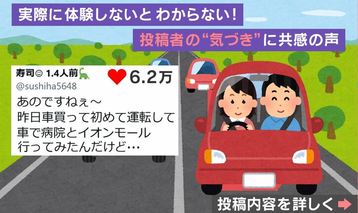 「今までごめん!!」初めての運転で痛感した“気づき”に「免許取りたてのとき同じこと思ってた」「経験しないとわからない」と反響 わたしとニュース 2026/02/26 11:30 拡大する 初めての運転で痛感した“気づき”が、話題になっている。 投稿したのは、寿司1.4人前さん(@sushiha5648)。車を買って初めて運転して気づいたことを、Xに投稿した。 続きを読む
