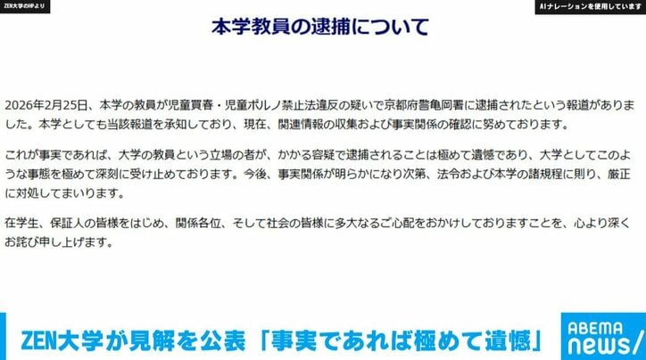 ZEN大学が見解を公表「事実であれば極めて遺憾」 速報 2026/02/26 12:10 拡大する ZEN大学のホームページが更新されました。「本学教員の逮捕について2026年2月25日、本学の教員が児童買春・児童ポルノ禁止法違反の疑いで京都府警亀岡署に逮捕されたという報道がありました。本学としても当該報道を承知しており、現在、関連情報の収集および事実関係の確認に努めております。これが事実であれば、大学の教員という立場の者が、かかる容疑で逮捕されることは極めて遺憾であり、大学としてこのような事態を極めて深刻に受け止めております。 続きを読む