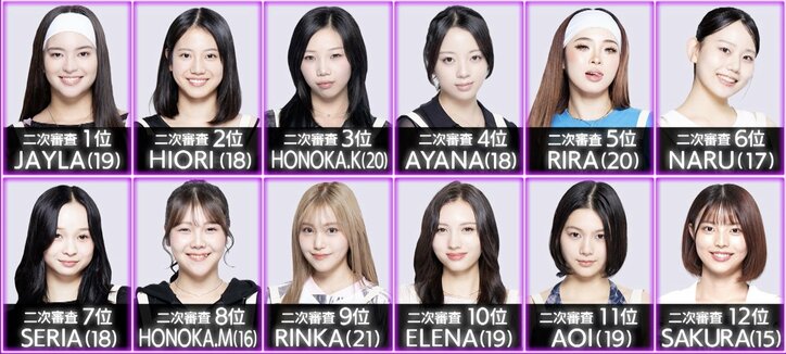 大波乱!2次審査でTOP12名が決定&7名が脱落…HYBEオーディション、番狂せに指原が衝撃『WORLD SCOUT: THE FINAL PIECE』 WORLD SCOUT: THE FINAL PIECE 2026/03/03 23:17 拡大する 3日に放送された『WORLD SCOUT: THE FINAL PIECE』第2話にて、3次審査にコマを進める12名が発表、7名が脱落した。 2次審査では歌とダンスの両方で参加者が審査され、19名中12名が、3次審査へコマを進めることができる。番組後半では総合1位から順に合格者の名前が呼ばれていった。以下、合格者と脱落者は以下の通り。1位:JAYLA(大城莉瑛羅・19歳) 2位:HIORI(津波古妃織・18歳) 3位:HONOKA.K(黒川穂香・20歳) 4位:AYANA(桑原彩菜・18歳) 5位:RIRA(村田莉花・20歳) 6位:NARU(松浦なる・17歳) 7位:SERIA(城守星愛・18歳) 8位:HONOKA.M(森穂乃香・16歳) 9位:RINKA(荒武凜香・21歳) 10位:ELENA(土方エレナ・19歳) 11位:AOI(大谷碧空・19歳) 12位:SAKURA(飛咲来・15歳) 続きを読む