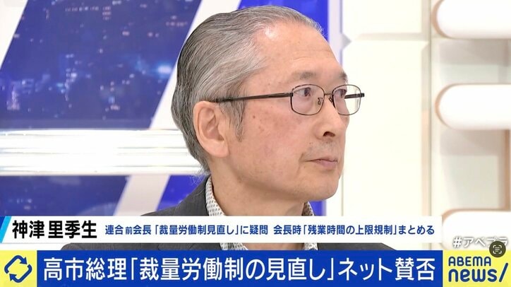 高市総理の“裁量労働制の見直し”は「100害あって1利なし」連合前会長が警鐘鳴らすワケ ABEMA Prime 2026/02/28 14:35 拡大する 施政方針演説で、高市総理が言及した裁量労働制の見直し。そもそも裁量労働制とは、実際に働いた時間ではなく、あらかじめ決められた労働時間を働いたとみなし、賃金を支払う制度のこと。 裁量労働制の見直しに対し、連合前会長の神津里季生氏が「100害あって1利なしだ」と『ABEMA Prime』で強い懸念を示した。 続きを読む