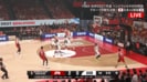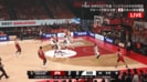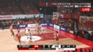 韓国のシュートが落ちてジョシュ・ホーキンソンがリバウンド。齋藤がボールを引き取って相手コート内に運んだ。イ・ジョンヒョンのマークを受けた齋藤だが、流石のハンドリングでゴール下にドライブしていく。すると次の瞬間、後ろに向かってノールックのバックハンドパスを通す。ボールを受けたホーキンソンはフリーな状況から3ポイントシュートを沈めた。