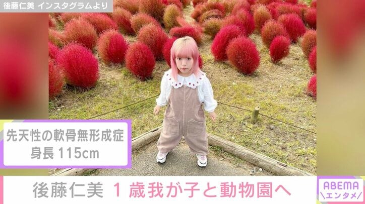 身長115cmモデル・後藤仁美、1歳の我が子と動物園での親子ショットに反響「とてもステキです」 ABEMAエンタメ 2026/03/02 20:33 拡大する 先天性の軟骨無形成症により115cmという低身長でモデルとして活躍している後藤仁美が、動物園での親子ショットを公開した。 2017年2月に結婚し、2024年5月には第1子を出産したことを報告していた後藤。これまでInstagramでは、子どもを抱えて沖縄の海を眺める写真や、IKEAでの親子ショットなど、日常の様子を発信してきた。 続きを読む