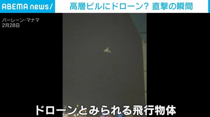 イランから飛来か 高層ビルに“ドローン”直撃 ガラス飛び散り爆発する瞬間 バーレーン わたしとニュース 2026/03/04 18:30 拡大する バーレーンの首都・マナマの高層ビルで、イランから飛来したドローンとみられる飛行物体が建物を直撃する映像が公開された。 映像には、轟音とともに迫りくる物体が映っている。そして爆発した。上のフロアに衝突した後、辺りが急に明るくなり、ガラスの破片が飛び散っている。 アメリカ海軍の司令部があるバーレーン。首都マナマと、隣接するムハッラクではドローン攻撃と迎撃ミサイルの破片により、これまでに3棟の建物が損傷したという。(『ABEMA NEWS』より) 続きを読む