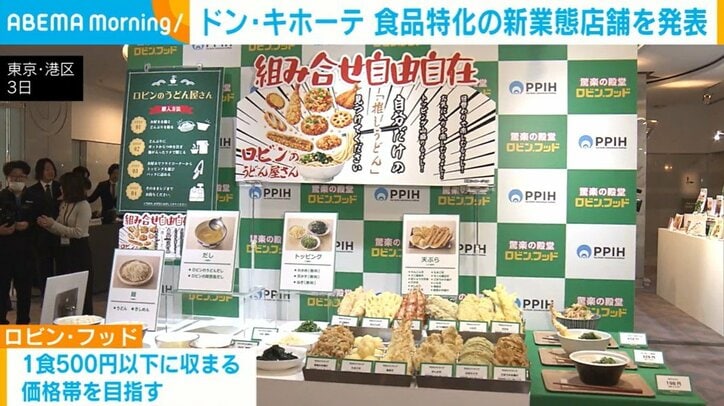 ドン・キホーテ 食品特化の新業態店舗を発表 速報 2026/03/04 09:34 拡大する ディスカウントストア「ドン・キホーテ」の運営会社が新たに食品に特化した店舗を展開すると発表しました。 「ドン・キホーテ」の新業態の店舗「ロビン・フッド」は、店内商品の4割ほどを生鮮食品や惣菜など食品が占めています。 85円(税込み)のおにぎりや214円(税込)の素うどんなど一食500円以下に収まる価格帯を目指したということです。 原材料費の高騰や高止まりするコメ価格の影響などで値上げが続いていますが、ロビン・フッドは、グループ会社が展開するスーパーの食品調達力などを生かすことで原材料費を抑えられたと説明しています。 続きを読む