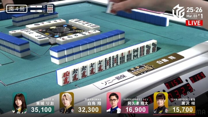 その赤5筒ツモ切り、何よ!?美女雀士、ライバルの打牌にびっくり仰天 思わず水を吹き出しそうになる緊急事態に発展/麻雀・Mリーグ Mリーグ 2026/03/04 13:00 拡大する 「大和証券 Mリーグ2025-26」3月3日の第1試合、BEAST X・東城りお(連盟)が、ライバルの放った衝撃の一打に対し、飲んでいた水を吹き出しそうになるほど驚愕する一幕があった。 場面はオーラスの南4局。東城は3万5100点持ちのトップ目、2着目の渋谷ABEMAS・白鳥翔(連盟)は3万2300点持ちと、その差はわずか2800点の僅差で迎えた。東城は序盤から役牌の中を鳴いて逃げ切りを図るが、7巡目、白鳥に運命の分岐点が訪れる。 続きを読む