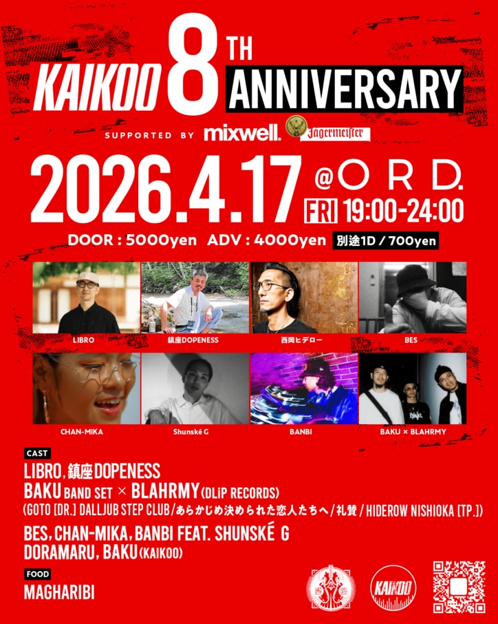 BAKUが主宰するコミュニティークルー、レーベル”KAIKOO"の会社設立8周年パーティーが4月17日(金)にORDで開催! 2026/03/04 18:12 拡大する DJ、プロデューサー、ターンテーブリストとしてキャリア30年を誇るBAKUが主宰するコミュニティークルー、レーベル”KAIKOO"の会社設立8周年パーティーを、昨年5月末代官山にオープンしたライブハウスとクラブの要素を兼ね備え、表現者にとって自由に活用できる新しいミュージック・ヴェニューORD.で開催する。BAKU (KAIKOO)の盟友たちによるショーケースが華を添える。KAIKOO 8th Anniversary Supported by MIXWELL, Jägermeister 続きを読む