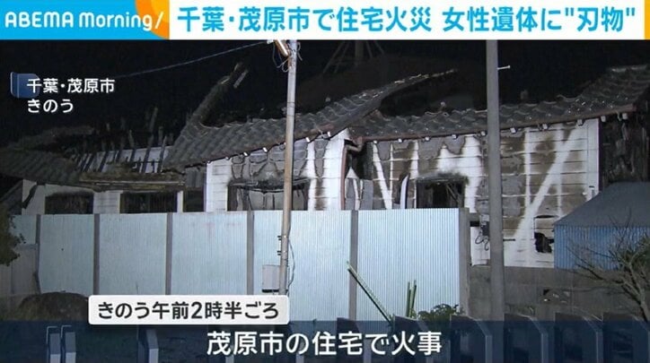 千葉・茂原市で住宅火災 女性遺体に“刃物” 速報 2026/03/05 09:12 拡大する 千葉県茂原市の住宅火災で、焼け跡から見つかった遺体に刃物のようなものが刺さっていたことがわかりました。横田陸記者レポート「目撃した人によると、爆発音がして、2階から5mほどの高さまで炎があがっていたということです」 きのう午前2時半ごろ、茂原市の住宅で火事がありました。 警察によりますと、この家には80代の母親と60代の息子が2人で住んでいましたが、焼け跡から刃物のようなものが刺さった母親とみられる女性の遺体が見つかったということです。 続きを読む