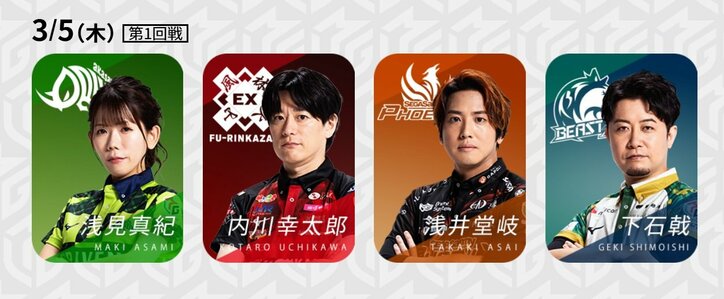 賞金もポイントも渡さない!首位EX風林火山、残り16戦の戦い方は/麻雀・Mリーグ Mリーグ 2026/03/05 19:00 拡大する Mリーグ機構は「大和証券Mリーグ2025-26」、3月5日の第1試合に出場する4選手を発表した。4チーム全てトータルプラスだが、注目は首位のEX風林火山。このまま首位でレギュラーシーズンを走りきり、賞金ゲットなるか。 各チーム、残り試合が10試合前後となる中、EX風林火山はまだ16試合残している。レギュラーシーズン突破には影響はないが、とにかく首位は渡したくない。ポイントはもちろんながら、賞金300万円を2位・KONAMI麻雀格闘倶楽部も虎視眈々と狙っている。次のステージに向けて弾みをつけるために、ポイントも賞金も渡さない。 続きを読む