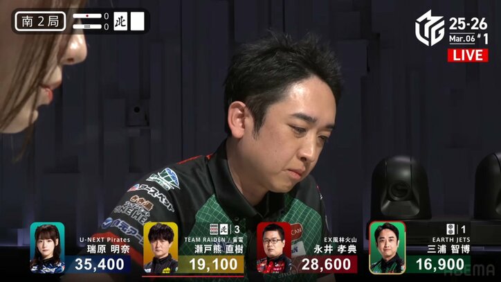 リーチした者の宿命…明らかに当たりそうな超危険牌 持ってきてしまった悲運の雀士、ためらいの数秒が切ない…/麻雀・Mリーグ Mリーグ 2026/03/07 12:00 拡大する 「大和証券Mリーグ 2025-26」3月6日の第1試合。熾烈な着順争いが繰り広げられる中、EARTH JETS・三浦智博(連盟)を襲ったあまりにも残酷な結末に、視聴者からも同情の声が漏れた。 場面は南2局、三浦は1万6900点持ちのラス目に沈んでいた。なんとか素点を回復し、南4局に控える自身の親番へ望みをつなげたい局面。配牌には四万の暗刻、六万の対子があり、中張牌も固まっている。タンヤオへと育てればアガリは早そうな、勝負権のある手牌だった。 続きを読む