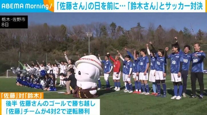 「佐藤さん」の日を前に…「鈴木さん」とサッカー対決 速報 2026/03/09 08:39 拡大する 語呂合わせによる「佐藤さん」の日の3月10日を前に、「佐藤さん」と「鈴木さん」の“絶対に負けられない戦いが”開催されました。 8日、栃木県佐野市で、日本の名字で一番多い「佐藤さん」と二番目に多い「鈴木さん」が全国から集まり、それぞれの名字のプライドをかけた頂上決戦として、サッカーで対決しました。 試合は前半、「鈴木」チームがPKで先制したものの、後半に入り「佐藤さん」のゴールで勝ち越した「佐藤」チームが4対2で勝利しました。 続きを読む