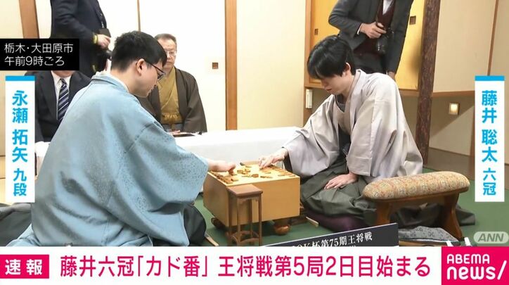 藤井六冠「カド番」 王将戦第5局2日目始まる 速報 2026/03/09 10:19 拡大する 将棋の藤井聡太六冠(23)に永瀬拓矢九段(33)が挑戦する王将戦の第5局2日目が始まりました。 ここまで3勝1敗と勢いに乗る永瀬九段がタイトルを奪取するのか、「カド番」の藤井六冠が粘りを見せるのか、第5局は夕方以降に決着します。 王将戦七番勝負の第5局の2日目は、栃木県大田原市の「ホテル花月」で、永瀬九段が封じた46手目が開封され、午前9時から始まりました。 ここまで挑戦者の永瀬九段が第3局と第4局に連勝し3勝1敗としていて、タイトル奪取まであと1勝です。藤井六冠は負ければ後がない「カド番」に追い込まれています。 続きを読む