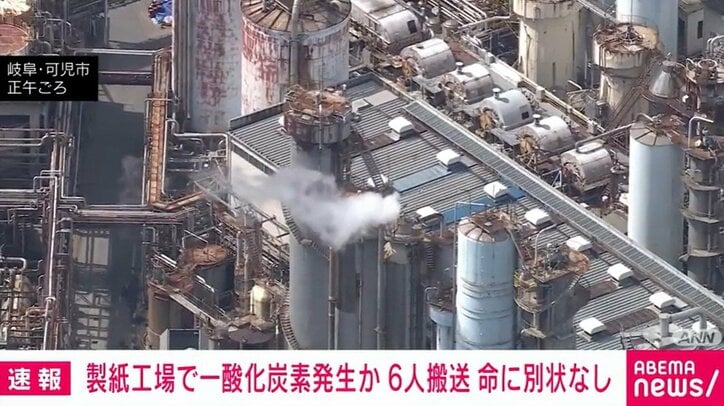 製紙工場で一酸化炭素発生か 6人搬送 命に別状なし 速報 2026/03/10 18:37 拡大する きょう午前、岐阜県可児市の製紙工場で、高濃度の一酸化炭素が漏れたとみられ、作業員の男性ら6人が病院に運ばれましたが、命に別状はないということです。 消防によりますと、午前9時50分ごろ、岐阜県の大王製紙可児工場で、「作業中の男性がガスを吸った」と工場の関係者から119番通報がありました。 警察によりますと、工場で一酸化炭素を送るためのバルブの調子が悪く、交換作業をしていたところ何らかの原因で、一酸化炭素が漏れたとみられています。 続きを読む