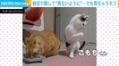 最初は一生懸命、前足で隣を見ないようにがんばっているが、チラッと見てしまったのが最後。もうご飯から目が離せなくなっている。飼い主によると、2匹はご飯のメニューが違うため、こもちくんは、お兄ちゃんのご飯が気になるようでたびたび見ているとのこと。飼い主も「食べたくて仕方ないのだろう」と思いつつも、「このご飯は茶々のだからダメだよー」といつも伝えているのでこもちくんは我慢しているんだとか。