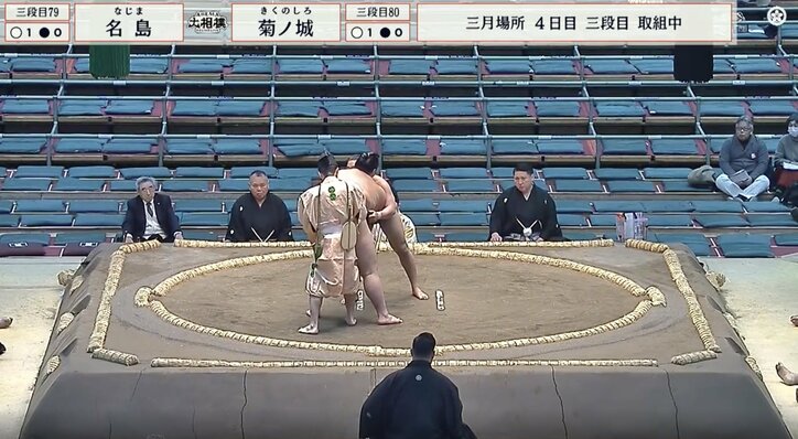 「まわしが」大相撲で“あわや”のハプニング 館内に響く「動くな!」の声、行司の神対応に「よく気づいた」称賛も 大相撲 2026/03/11 15:21 拡大する <大相撲三月場所>◇四日目◇11日◇大阪・エディオンアリーナ 三段目の取組で、土俵上が緊張感に包まれる“あわや”のハプニングが発生した。激しい攻防の最中、一方の力士のまわしが解けかかる事態に、行司が「待った」をかけ中断。館内に「動くな!」という鋭い声が響き渡る異例の光景に、ファンからは驚きとともに、冷静な対応を見せた行司への称賛が相次いだ。 問題のシーンは、三段目七十九枚目・名島(湊)と三段目八十枚目・菊ノ城(秀ノ山)の一番で起こった。結び目が緩み、あわや“ポロリ”という危機を救ったのは、行司の機転だった。 続きを読む