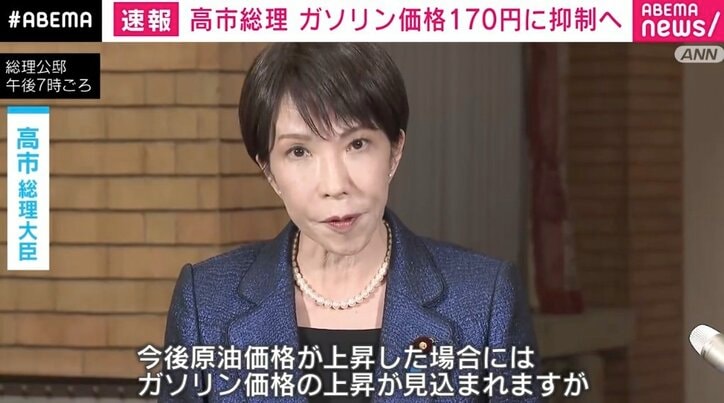 高市総理 ガソリン価格170円に抑制へ 速報 2026/03/11 20:48 拡大する 高市総理大臣は、イラン情勢を受けた原油価格の高騰を踏まえ、ガソリン価格を全国平均で170円程度に抑える措置を講じるとともに、国家備蓄を放出する方針を明らかにしました。 高市総理は、11日夜、総理公邸で記者団に対し、原油価格が高騰する中、ガソリン価格が1リットルあたり200円を超える可能性も否定できないとして、国民生活や経済活動への影響を抑えるため、赤沢経済産業大臣に対し緊急の激変緩和措置を早急に実施するよう指示したと説明しました。 続きを読む