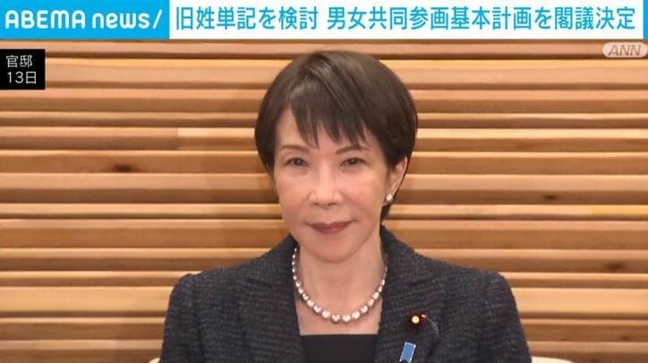 旧姓単記を検討 男女共同参画基本計画を閣議決定 速報 2026/03/13 15:40 拡大する 政府は、13日の閣議で男女共同参画社会の実現に向けて今後5年間の方針を示した基本計画を決定しました。公的書類などに旧姓のみを記載する「単記」を検討すると明記されています。木原官房長官「旧氏の単記も可能とすることを含めた取り組みが一層進めば、婚姻などによる氏の変更によって社会生活で不便や不利益を感じる方をさらに減らすことができると考えています」 今回閣議決定された「第6次男女共同参画基本計画」では、「旧氏の単記も可能とする法制化を含めた基盤整備の検討を含め、旧氏使用の更なる拡大やその周知に取り組む」と明記されました。 続きを読む