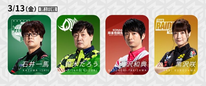 サバイバルレース最終盤!赤坂ドリブンズ VS TEAM雷電 絶対に負けられない一日/麻雀・Mリーグ Mリーグ 2026/03/13 19:00 拡大する Mリーグ機構は「大和証券Mリーグ2025-26」、3月13日の第1試合に出場する4選手を発表した。リーグ5位・赤坂ドリブンズと同6位・TEAM雷電は、レギュラーシーズン突破のボーダーラインすれすれ。2チームともにラインから離れるのか、それとも近づくのか。とにかく負けられない一日だ。 現在、7位の渋谷ABEMASが▲147.2。5位から7位までが63.5ポイントの中にいる大接戦で、3チームのうち2チームが生き残るという様相だ。同卓する他の2チームはポイントが離れており、仮に劣勢になった場合「ライバルにトップを取られるくらいなら…」と、この2チームの力を借りるようなプレーも見られるかもしれない。 続きを読む