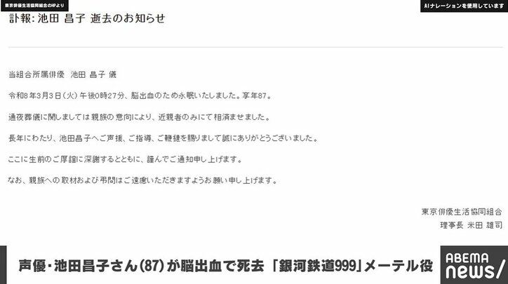 声優・池田昌子さん(87)が脳出血で死去 「銀河鉄道999」メーテル役 速報 2026/03/13 18:51 拡大する 東京俳優生活協同組合からの発表です。「訃報:池田 昌子 逝去のお知らせ当組合所属俳優 池田 昌子 儀令和8年3月3日(火)午後0時27分、脳出血のため永眠いたしました。享年87。通夜葬儀に関しましては親族の意向により、近親者のみにて相済ませました。長年にわたり、池田昌子へご声援、ご指導、ご鞭撻を賜りまして誠にありがとうございました。ここに生前のご厚誼に深謝するとともに、謹んでご通知申し上げます。なお、親族への取材および弔問はご遠慮いただきますようお願い申し上げます」 続きを読む