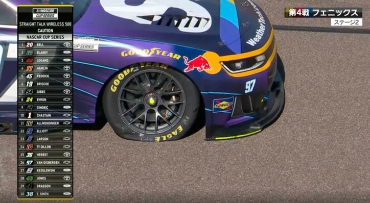 「なにこの同時多発」シボレーに相次ぐ“集団パンク”…異例の光景に中継騒然「みんな右前」「グッドイヤーさんどうなってんの?」 NASCAR 2026/03/14 11:50 拡大する 【NASCAR】第4戦 Straight Talk Wireless 500(フェニックス・レースウェイ/日本時間3月9日) 全米人気ナンバーワンのレース、NASCAR(ナスカー)の今季第4戦がアリゾナ州エイボンデールで開催された。レース中盤、4台のマシンが連続してタイヤをバーストさせる奇怪なトラブルが発生し、ファンを驚かせることとなった。 312周で争われるレースの157周目、ノア・グラーグソンの4号車がコース外側のウォールに激突したため、イエローコーションが発出された。4号車は右フロントから白煙を出しており、これに対し、解説のジャック・アマノ氏は、「右フロントタイヤが先にいった(バーストした)のか…減速しないで壁までいっちゃった感じですね」とコメントしている。 続きを読む