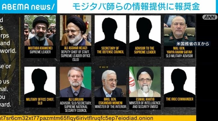 モジタバ師らの情報提供に報奨金 速報 2026/03/14 14:48 拡大する アメリカ国務省はイランの最高指導者、モジタバ師らに関する情報提供に対して、最大1000万ドル=およそ16億円の報奨金を支払うと表明しました。 アメリカ国務省は13日、イランの政権幹部らに関する情報を提供すれば、最大1000万ドル=およそ16億円の報奨金の支払いと移住の資格を与えると表明しました。 情報を求める10人の対象者には、ハメネイ師の次男で新しい最高指導者に選出されたモジタバ師や国家安全保障最高評議会のラリジャニ事務局長が含まれています。 続きを読む