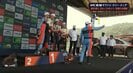 国際映像は、コース上で激走を続けている勝田のマシンを追いながら、ワイプで先に走行を終えていたフルモーのインタビューを映し出した。フルモーは「勝田選手、初優勝おめでとうと言いたいと思います」と、勝田がまだ走行中にも関わらず異例のコメントを残した。物理的にはまだ逆転の可能性が残る状況での祝福に、実況の布施宏倖アナウンサーも「今、フルモーから少し早いおめでとうがありました」と言及。