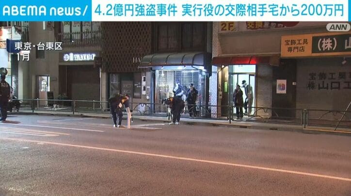 4.2億円強盗事件 実行役の交際相手宅から200万円 速報 2026/03/16 14:23 拡大する 東京・台東区の現金4億円強盗事件で、逮捕された実行役の交際相手の自宅から現金200万円が見つかったことが新たにわかりました。 指定暴力団山口組系の幹部・狩野仁琉容疑者(21)や村田亜怜容疑者(27)ら7人は、1月、台東区で現金4億2000万円ほどが入ったスーツケースを奪ったなどの疑いがもたれています。 その後の捜査関係者への取材で、実行役の村田容疑者の交際相手の自宅から現金200万円が見つかったことがわかりました。 続きを読む