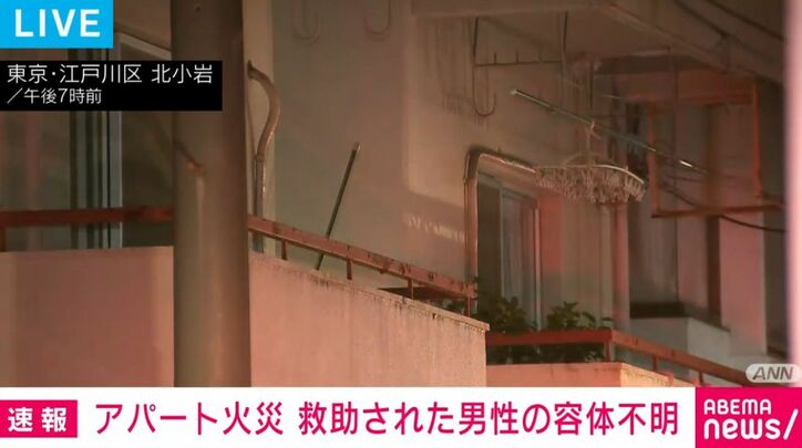 アパート火災 救助された男性の容体不明 速報 2026/03/16 19:31 拡大する 東京・江戸川区のアパートで火事があり、現在も消火活動が続いています。男性1人が救助されていますが容態などは分かっていません。 午後5時半ごろ、江戸川区北小岩の3階建てのアパートで2階の部屋から火が出ました。 東京消防庁によりますと、ポンプ車など16台が出動し現在も消火活動が続いています。これまでに火元の部屋のおよそ10平方メートルが焼けました。 現場から男性1人が救助されていて、東京消防庁などが男性の容態などの確認を急いでいます。 続きを読む