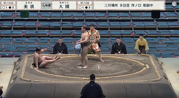 取組前に「倒しちゃった」 行司「待て待て待て!」制止も…立ち合いのハプニングにファン驚き「これはケンカの予感」 大相撲 2026/03/16 20:16 拡大する <大相撲三月場所>◇九日目◇16日◇大阪・エディオンアリーナ 序ノ口の取組で、立ち合い勢いよくつっかけた力士が相手力士を突き飛ばす場面があった。不意を突かれた相手力士は豪快に尻餅をつき、「倒しちゃった」「やってしもうた」とファンに緊張が走った。 序ノ口十三枚目・美浪(秀ノ山)と序ノ口八枚目・大國(追手風)の一番での出来事。行司が「待ったなし」と力強く呼びかけた直後、立ち合いタイミングが合わず大國がつっかけてしまう事態に。「まだまだまだ!」と行司が制止するも、大國は勢い止まらず、腰を落としたままの美浪に強烈なひと突きを浴びせてしまった。 続きを読む