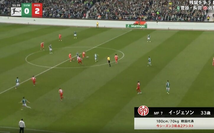 ウソでしょ!? 佐野海舟、目を疑う“一瞬の動き”「速すぎ!」天才的な“読み”→一瞬でボール奪取… 追加点を生む“攻撃的守備” ブンデスリーガ 2026/03/17 06:30 拡大する 【ブンデスリーガ】ブレーメン 0-2 マインツ(日本時間3月15日/ヴェーザーシュタディオン)マインツに所属する日本代表MF佐野海舟のインターセプトから追加点が生まれた。相手のプレーを読む力と、鋭い出足が融合したボール奪取のシーンにファンたちが歓喜している。マインツは日本時間3月15日、ブンデスリーガ第26節でブレーメンと敵地で対戦した。勝ち点1差で迎えた残留争いのライバルチームとの対戦で、佐野はアンカーとしてスタメン出場している。試合は5分にMFパウル・ネーベルのゴールでマインツが先制。その後も主導権を握って試合を進めると、52分には佐野のプレーを起点に追加点を挙げる。 続きを読む
