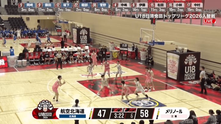 「よくあんな隙間に」女子高校2年生のパスマスター、針の穴を通す“ノールックパス”にバスケYouTuberが興奮 U18日清食品トップリーグ 2026/03/17 06:00 拡大する 【U18日清食品トップリーグ2026入替戦 女子】日本航空高等学校 北海道 70ー91 四日市メリノール学院高等学校(3月15日/東洋大学赤羽台キャンパスHELSPO HUB-3アリーナ) 四日市メリノール学院高等学校(三重県)の2年生、中嶋とわがノールックの“神パス”を披露 。針の穴を通すようなアシストでアリーナを沸かせた。 3月15日、U18日清食品トップリーグ2026入替戦の女子決勝が行われ、メリノールはトップリーグへの昇格をかけて日本航空高等学校北海道(北海道)と対戦した。 続きを読む