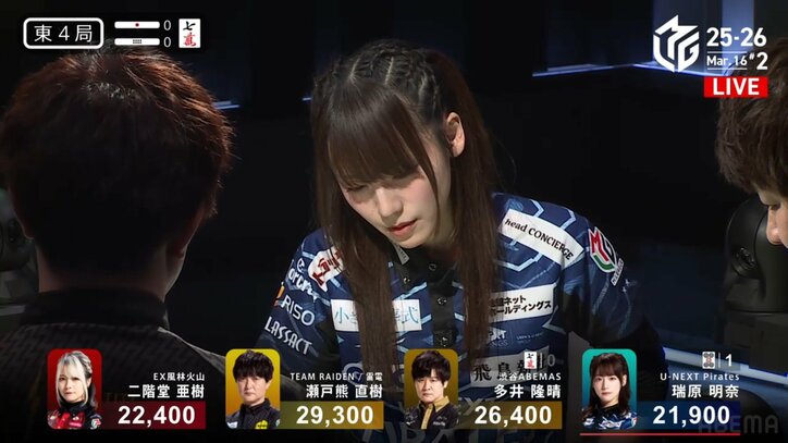 三面張かカンチャンか…河が惑わせる複雑な事情 美人雀士の迷う表情にファンは夢中「かわいい顔」「いい表情」/麻雀・Mリーグ Mリーグ 2026/03/17 13:00 拡大する 「大和証券Mリーグ2025-26」3月16日の第2試合、U-NEXT Pirates・瑞原明奈(最高位戦)が、卓上の複雑な状況に長考するシーンがあり、その真剣な眼差しと美貌がファンの間で大きな話題となった。 場面は東4局。瑞原は2万1900点持ちのラス目ながら、トップ目のTEAM雷電・瀬戸熊直樹(連盟)が2万9300点持ちと、全員が2万点台にひしめき合う大接戦。親番の瑞原は、面子こそないもののドラの七万が対子の配牌を手に、逆転の機を伺っていた。 続きを読む