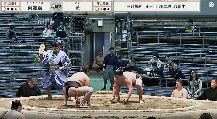 「ガラわる!」「つまみ出してください」大相撲の客席から突然の“怒号” 取組直前の奇声に「力士が可哀想」憤りの声 大相撲 2026/03/17 09:11 拡大する <大相撲三月場所>◇九日目◇16日◇大阪・エディオンアリーナ 大阪・エディオンアリーナで開催中の大相撲三月場所。九日目、序二段の取組で、客席から突如として“怒号”が響く場面があった。威圧するような大声に「こわい」「ガラわる!」とファン騒然となった。 問題の場面は、序二段五十八枚目・東颯海(玉ノ井)と序二段四十六枚目・藍(高田川)の一番で起きた。取組前、呼出に四股名を呼び上げられて土俵に登場した両力士。すると、まだ観客もまばらな客席からは「あい頑張れー!あーい!」「あーい!」「あーい!」と、怒鳴り声のような男性の野太い声援が飛んできた。 続きを読む
