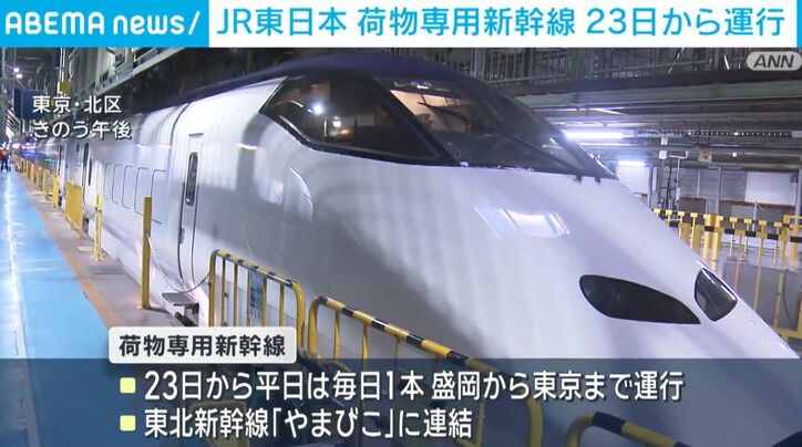 JR東日本 荷物専用新幹線 23日から運行 速報 2026/03/18 10:23 拡大する JR東日本は23日から運行が開始する「荷物専用新幹線」の積み下ろしなどの訓練を行いました。 荷物専用新幹線は23日から、平日は毎日1本、盛岡から東京まで運行します。東北新幹線「やまびこ」に連結させます。 床には滑り止めシートが貼ってあり、積み荷が動かないように工夫されています。またホームには無人の搬送車が待機し、積み荷を自動で駐車場まで運びます。 荷物専用新幹線は7両編成で、最大でおよそ1000個ほどの段ボールを運べるということです。(ANNニュース) 続きを読む