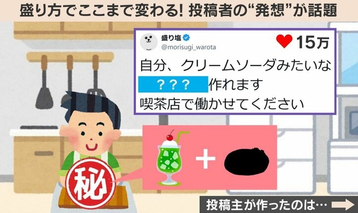 オムライスの“最終進化系”…!?「可愛いから店出した方がいい」「独特のセンスと可能性を感じます」発想力とビジュアルのインパクトに反響 わたしとニュース 2026/03/19 12:00 拡大する 盛り方の発想一つで、見慣れた料理が全く新しい姿に変わる投稿がSNSで話題を集めており、大きな反響を呼んでいる。 投稿したのは、盛り塩さん(@morisugi_warota)。クリームソーダみたいなオムライスを作れるという投稿主は、透明なパフェグラスに、赤いチキンライスと鮮やかな黄色の炒り卵を盛り付け、一番上にはアイスクリームに見立てた白いマッシュポテトらしきものを乗せた創作料理の写真とともに「喫茶店で働かせてください」とXに投稿した。喫茶店のクリームソーダそっくりの見た目に仕上がっており、その発想力とビジュアルのインパクトが注目を集めた。 続きを読む