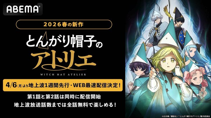 春アニメ『とんがり帽子のアトリエ』地上波1週間先行・WEB最速配信が決定!初回は1・2話連続放送 2026/03/18 19:20 拡大する ABEMAにて、2026年新作春アニメ『とんがり帽子のアトリエ』が、2026年4月6日(月)から毎週月曜日夜11時より、地上波1週間先行・WEB最速で配信されることが決定した。 『とんがり帽子のアトリエ』は、「モーニング・ツー」(講談社)にて連載中の白浜鴎によるファンタジー漫画が原作。“魔法を使えない者は魔法をかける瞬間を見てはならない”という掟がある世界で、魔法使いに憧れる小さな村の少女・ココが、魔法使いの青年・キーフリーの魔法を目にしてしまい、“大きな秘密”を知ることから始まるハイファンタジー作品である。 続きを読む 2026年冬アニメ(1月クール) 作品情報 もっとみる(67) 魔術師クノンは見えている