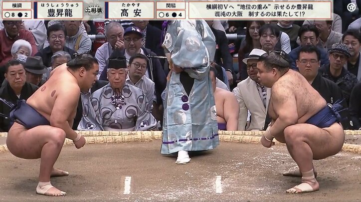 「高安は“行ってもいいぞ”という感じだった。豊昇龍が…」“25秒”にらみ合い直前の気になる動きを識者が指摘 横綱が2敗を死守で“荒れる春場所”大混戦 大相撲 2026/03/19 07:40 拡大する <大相撲三月場所>◇十一日目◇18日◇大阪・エディオンアリーナ 横綱・豊昇龍(立浪)と関脇・高安(田子ノ浦)が結びの一番で壮絶な睨み合いを繰り広げた。高安は時間前に立とうとする姿勢を見せ、その様子を見逃さなかった実況名物アナは「高安は“行ってもいいぞ”という感じ」と大興奮した。一体、高安はどんな動きをしたのか? 25秒ほどの長い睨み合いによって館内を熱気が包むなか、豊昇龍は“天敵”高安を下して2敗を死守、“荒れる春場所”の幕内優勝争いは混戦模様となった。 続きを読む