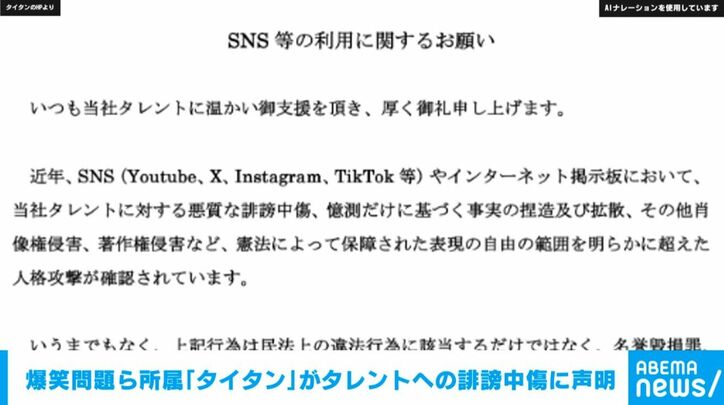 爆笑問題ら所属「タイタン」がタレントへの誹謗中傷に声明 速報 2026/03/19 16:58 拡大する タイタンからの発表です。「SNS 等の利用に関するお願いいつも当社タレントに温かい御支援を頂き、 厚く御礼申し上げます。 近年、 SNS (Youtube、X、Instagram、TikTok 等) やインターネット掲示板において、 当社タレントに対する悪質な誹謗中傷、憶測だけに基づく事実の捏造及び拡散、その他肖像権侵害、著作権侵害など、憲法によって保障された表現の自由の範囲を明らかに超えた人格攻撃が確認されています。 続きを読む