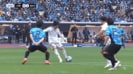 背番号40は左足の前にボールを置き、細かなステップでボールとの歩幅を調節し、左足をシャープに振り抜く。美しい弧を描いたボールは、ブロックに来ていた川崎のDF松長根悠仁、横っ飛びしていたGKスベンド・ブローダーセンの手をかわし、ゴールの左上隅に決まった。