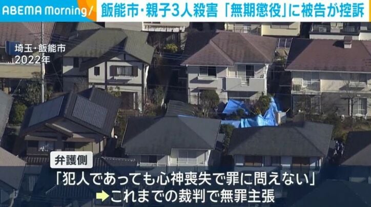 飯能市・親子3人殺害「無期懲役」に被告が控訴 速報 2026/03/24 08:52 拡大する 埼玉県飯能市で、アメリカ国籍の男性ら家族3人が殺害された事件で、1審で無期懲役の判決を言い渡された被告が控訴しました。 斎藤淳被告(43)は2022年12月、近くに住むウィリアム・ビショップさんと妻の森田泉さん、娘の森田・ソフィアナ・恵さんの3人をおので殺害した罪などに問われ、さいたま地裁は16日、無期懲役の判決を言い渡しました。 これまでの裁判で、弁護側は「犯人であっても心神喪失で罪に問えない」と無罪を主張していました。 続きを読む