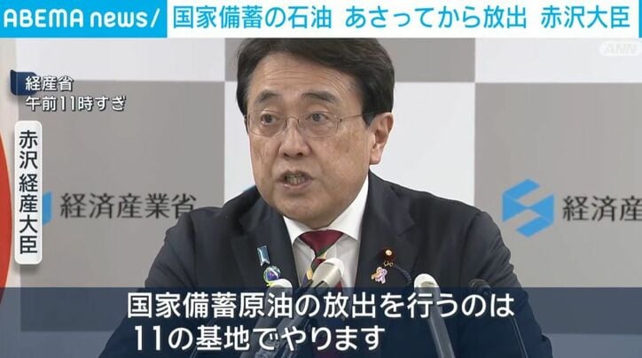 国家備蓄の石油 あさってから放出 赤沢大臣 速報 2026/03/24 15:59 拡大する 赤沢経済産業大臣は、国家備蓄の石油を北海道や九州・沖縄などあさって26日から順次放出することを明らかにしました。赤沢経済産業大臣「国家備蓄原油の放出を行うのは11の基地でやります」 放出する国家石油備蓄基地は、福岡の白島や愛媛の菊間、北海道の苫小牧東部など11か所です。 産油国との共同備蓄なども含まれます。 放出はあさって26日から順次行われ、5月ごろまで実施するということです。 石油の放出をめぐっては、16日からすでに民間の備蓄から開始されています。(ANNニュース) 続きを読む