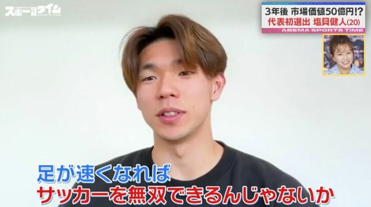 「うわっ、はや」ボルトを徹底研究?「足が速くなれば無双できる」森保JAPAN“初選出”異色経歴の新鋭がファンを圧倒 ABEMAスポーツタイム 2026/03/27 22:30 拡大する 3月22日放送の『ABEMAスポーツタイム』で、日本代表メンバーに“初選出”された弱冠20歳の新鋭・塩貝健人選手を特集。驚異的なステップアップを実現した論理的な研究スタイルとずば抜けた身体能力に、サッカーファンから驚きの声が多数寄せられた。番組ではW杯を控えるタイミングで代表に初選出された若手FWとして、塩貝選手の貴重なインタビュー映像を紹介。慶應義塾大学サッカー部に所属していた2023年から、翌年には横浜でJ1デビューを果たし、同年にオランダへ移籍。そして今年1月にドイツのヴォルフスブルクに移籍と、短期間で驚くべきステップアップを果たしている。 続きを読む