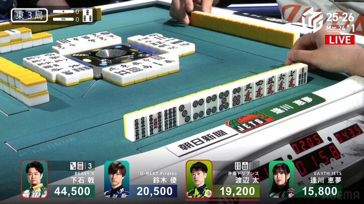 麻雀は理不尽だ…三色同順が目前のチャンス、前に進めばもれなく放銃の悲劇「これは無理だ」「当たる牌だらけすぎた」と同情の声多数/麻雀・Mリーグ Mリーグ 2026/03/25 11:00 拡大する 「大和証券Mリーグ2025-26」3月24日の第1試合で、EARTH JETS・逢川恵夢(協会)が、目の前にぶら下がった極上のチャンス手と、逃げ場のない「詰み」の状況に翻弄されるという、あまりに過酷な一局があった。 場面は東3局。1万5800点持ちのラス目に沈んでいた逢川は、挽回を期してこの局に臨んだ。配牌こそドラもなく両面ターツが2つのみと寂しいものだったが、そこから驚異のツモが押し寄せる。有効牌を次々と引き入れ、手牌はタンヤオ・平和、さらには345または456の三色同順まで見える絶好の勝負手へと急成長を遂げた。 続きを読む