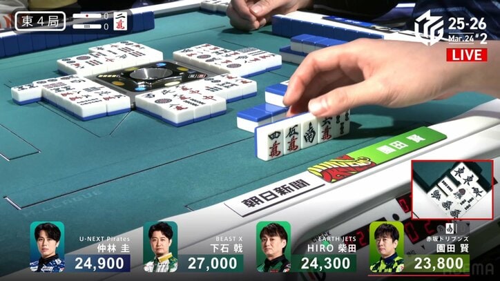 解説者も「なんだこりゃ」と爆笑 秀才雀士が見せた単騎待ち変化 その裏にあった緻密な読みにファンは「天才すぎ?」「レベル高すぎる」/麻雀・Mリーグ Mリーグ 2026/03/25 13:00 拡大する 「大和証券Mリーグ2025-26」3月25日の第1試合で、赤坂ドリブンズ・園田賢(最高位戦)が、緻密な思考の迷路にライバルと解説者を迷い込ませる、あまりにテクニカルな単騎待ち変化を披露。爆笑と感嘆が入り混じる異例の一局となった。 場面は東4局。親番の園田は2万3800点持ちの僅差ながらラス目。トップ目のBEAST X・下石戟(協会)を追うべく、加点が欲しい局面だった。園田は5巡目に發を鳴くと、9巡目にカン2索をチー。さらにダブ東もポンして、8索単騎のテンパイを入れた。 続きを読む